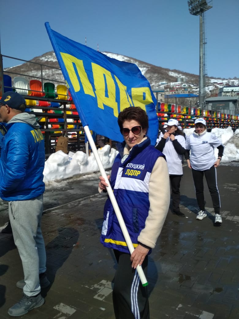 А депутат Гордумы Петропавловск-Камчатского городского округа Ирина Рыкова гордо держала партийный флаг, несмотря на свежий, порывистый камчатский ветер.